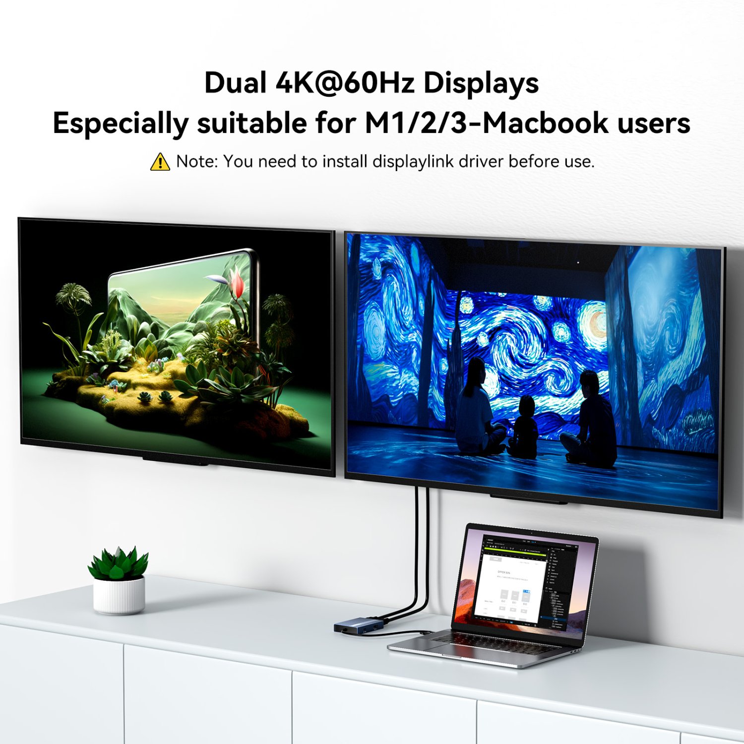 ACASIS USB to HDMI adapter 4K 60Hz, 2 HDMI and 3 USB-A ports, 100W PD charging, Mac display link