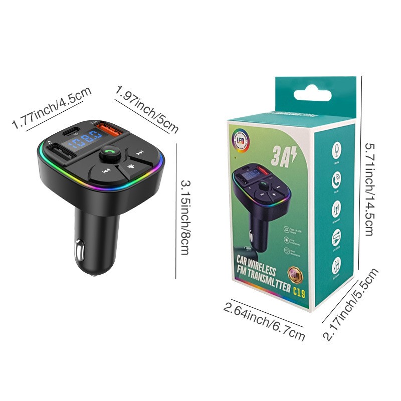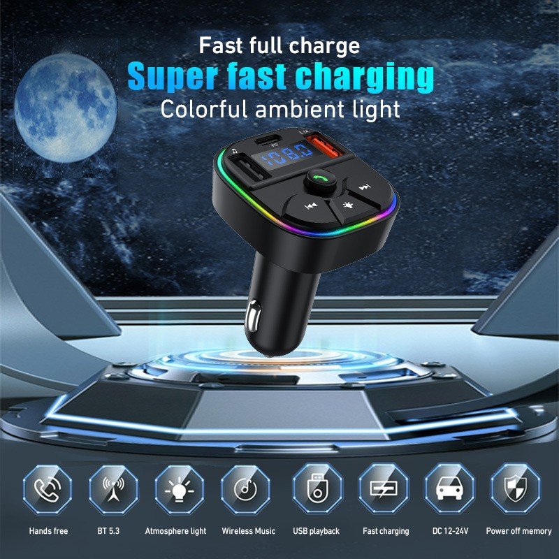 Portable car Bluetooth hands-free FM transmitter MP3 music player with USB connection PD charger and color ambient light