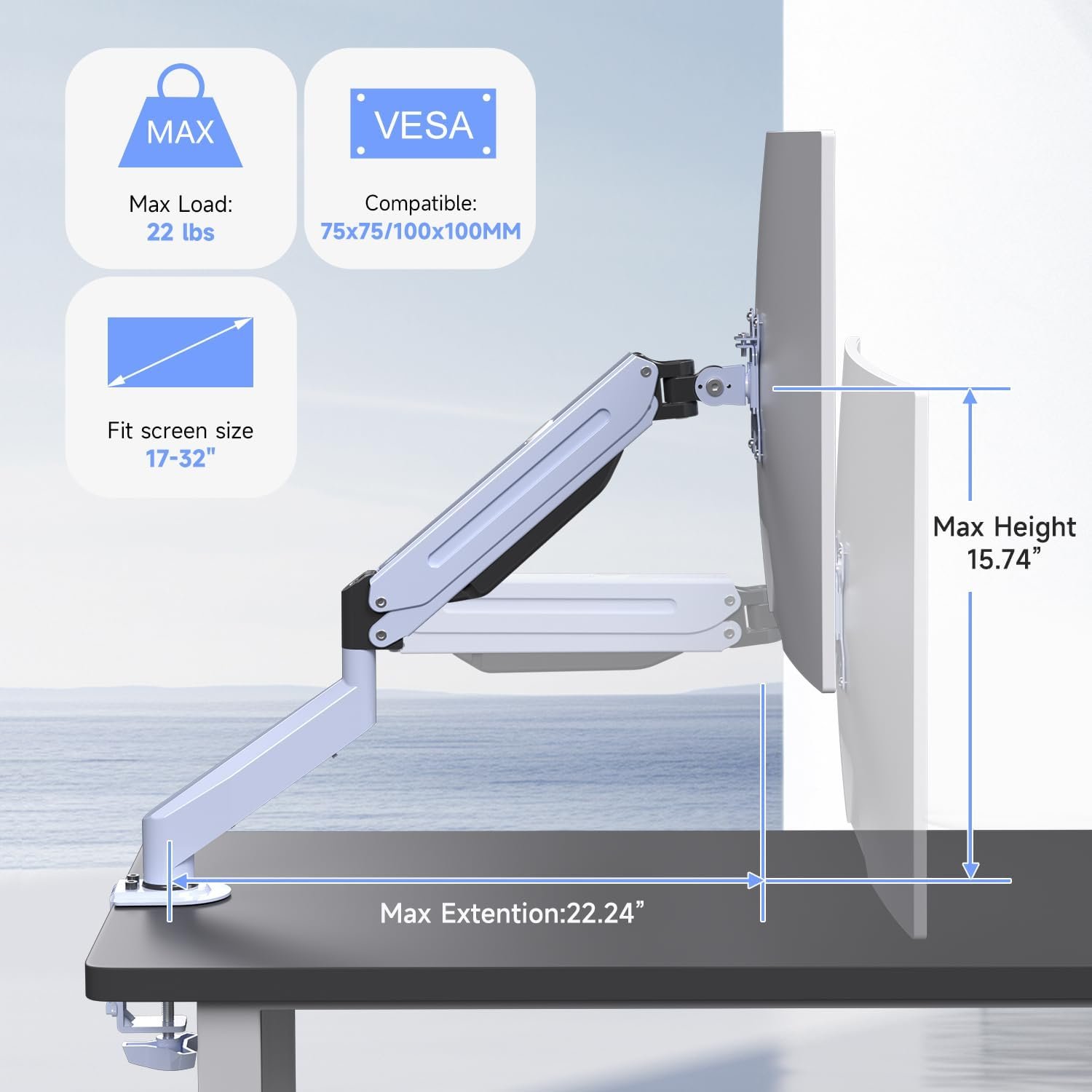 Monitor arm, gas spring monitor arm, desktop stand, fully adjustable, suitable for 17-32 inch monitors, load capacity up to 22 lbs.
