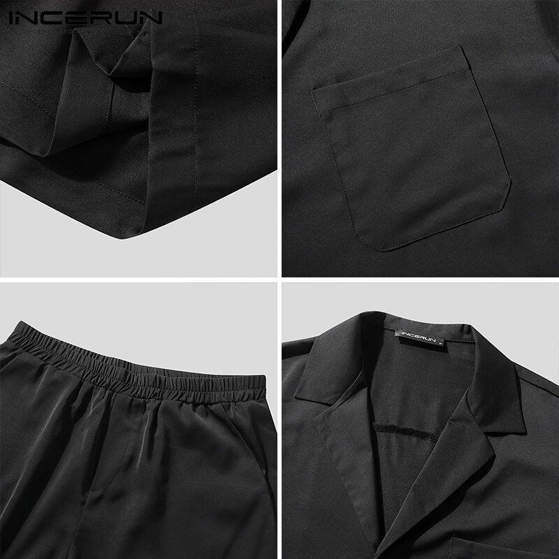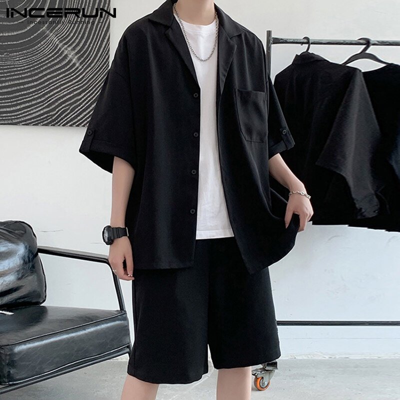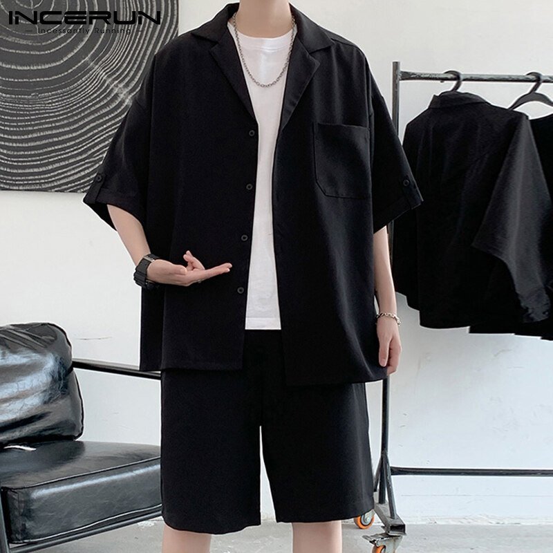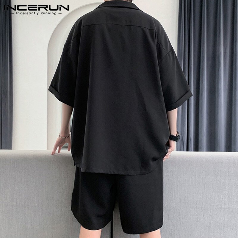 INCERUN Men Short Sleeve Korean Style Casual Suits Button Shirts Elastic Waist Short Sets (Korean Style)