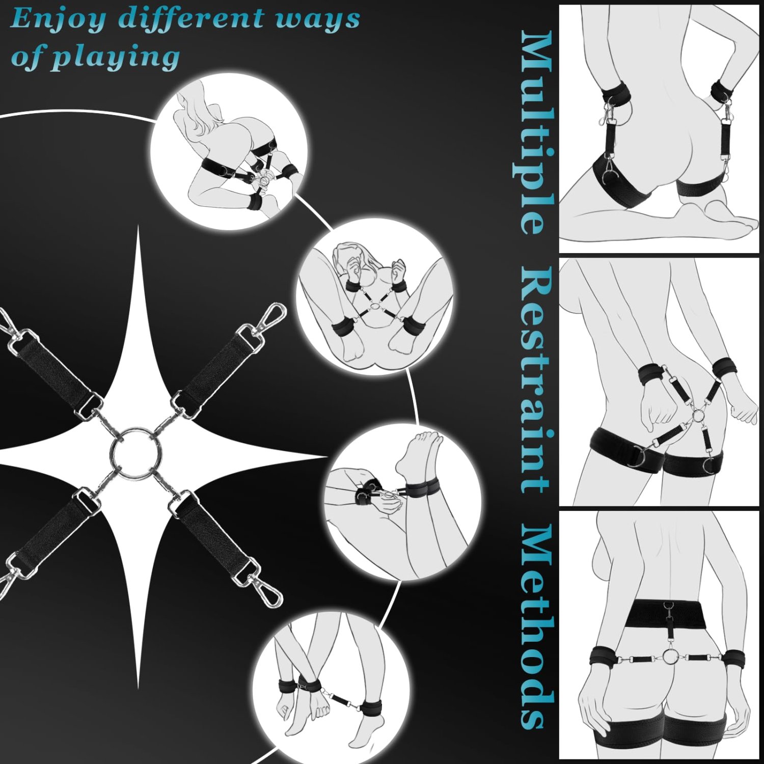 Adjustable handcuffs, leg cuffs, thigh cuffs, mouth cuffs, eye mask clips, 9-piece restraint kit, sexual restraint BDSM, female adult couple toy