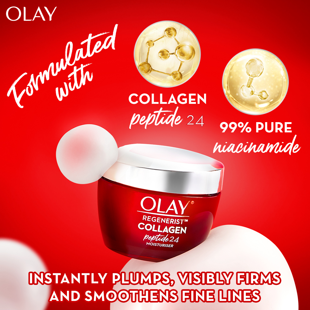 Plump & Bouncy Skin all day long. Olay’s Unique technology Collagen Peptide 24 penetrates^ better into the skin. Regular collagen have larger molecules that couldn’t penetrate into the skin. Olay’s Collagen Peptide is a smaller molecule, hence it penetrates^ better into the skin.